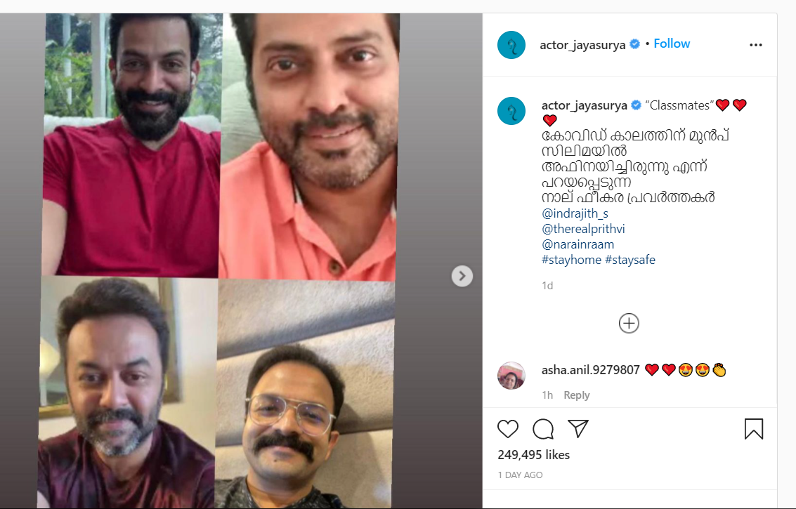 മലയാളസിനിമയക്ക് ഏറെ പ്രിയപ്പെട്ട നാല് താരങ്ങളുടെ ഇന്സ്റ്റഗ്രാം പോസ്റ്റായിരുന്നു കഴിഞ്ഞ ദിവസം സോഷ്യല്മീഡിയ കൗതുകത്തോടെ കണ്ടത്....