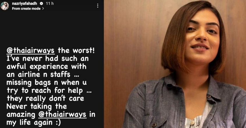വിമാനത്തിൽവച്ച് ബാഗ് നഷ്ടമായിട്ടും തായ് എയർവേയ്സ് അവഗണന കാട്ടിയെന്ന് ആരോപിച്ച് നടി നസ്രിയ നസീം. ഇൻസ്റ്റഗ്രാം സ്റ്റോറിയിലൂടെയാണ....